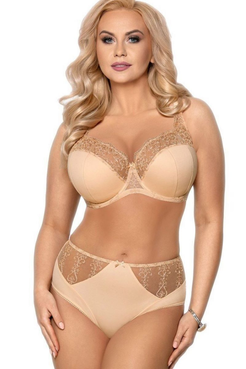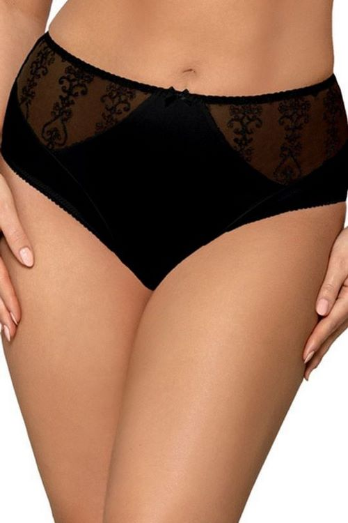 Figi damskie z wysokim stanem wykonane z miękkiej mikrofibry. Przód ze wstawkami z transparentnego tiulu zdobionego haftem. Majtki maja zabudowane boki i świetnie dopasowują się do sylwetki.