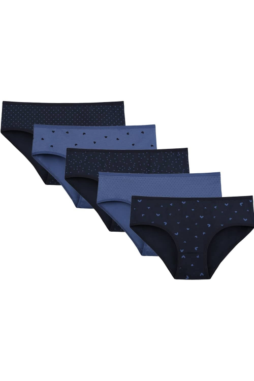 Bawełniane figi damskie ozdobione wzorem w delikatne kropeczki , pełny zabudowany krój . Pakowane w foliowy woreczek po dwie sztuki. Dostępne kolory: jeans-granat mix wzór. Skład: 95% bawełna, 5% elastan.