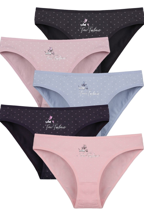 Bawełniane figi damskie. Pakowane po dwie sztuki w foliowy woreczek w różnych zestawach kolorystycznych. Skład: 95% bawełna, 5% elastan.