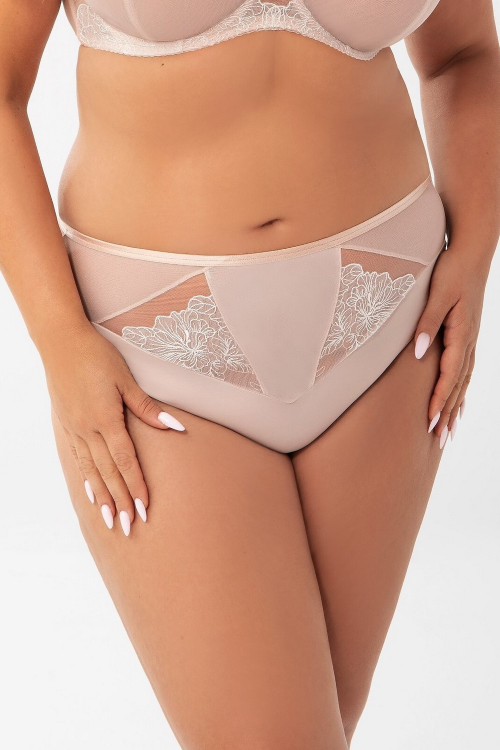 Figi damskie z gładkiej mikrofibry z przodu ozdobne wstawki siateczki z delikatnym haftem w talii płaska gumka , zabudowane biodra , tył z pionowym szwem. Skład: 90% poliamid, 7% elastan, 3% poliester.