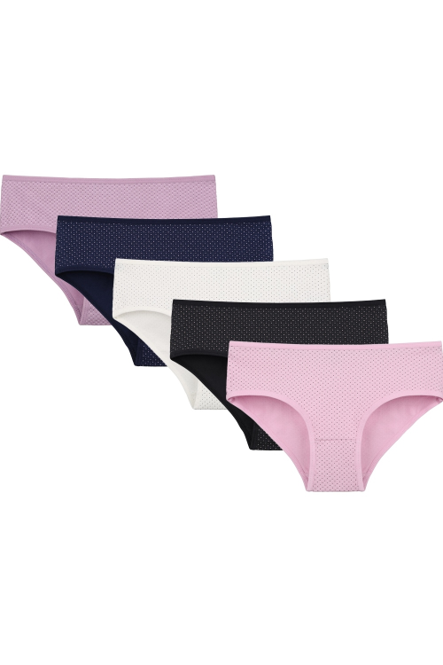 Figi damskie mix wzór. Pakowane po dwie sztuki w foliowy woreczek. Skład: 95% bawełna, 5% elastan.