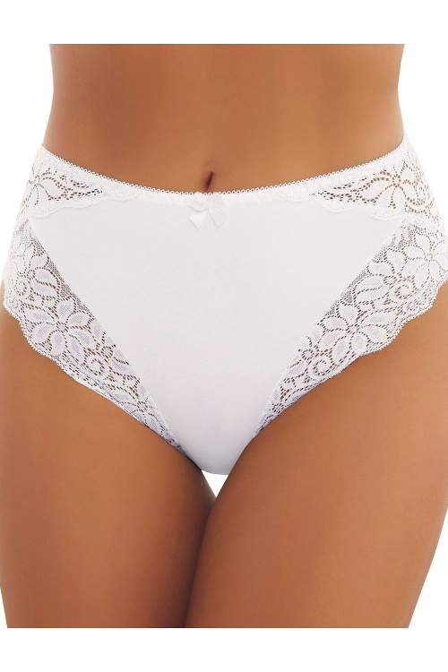 Figi damskie , wysoka linia talii , zabudowane biodra , wykonane z gładkiej bawełny w połączeniu z z ażurową koronką. Skład: 92% bawełna, 8% elastan; koronka 88% poliamid, 12% elastan.