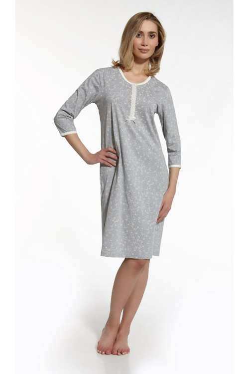 Koszula damska z wysokiej jakości bawełny w kwiatuszki, z rękawem 3/4. Dekolt zapinany na suwak. Długość do kolan. Idealna również dla mamy karmiącej.