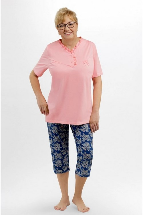 Piżama damska z delikatnej bawełny. Koszulka z krótkim rękawem, dekolt w kształcie litery "V", zapinany na guziki. Spodnie o długości 3/4. Skład: 100% bawełna.