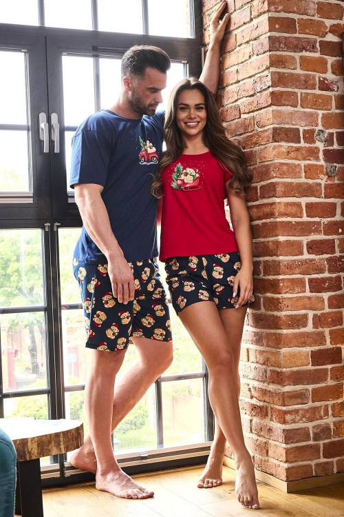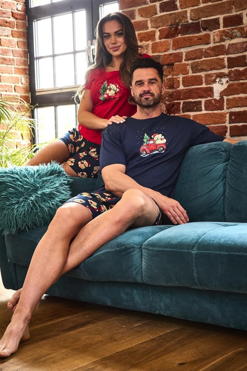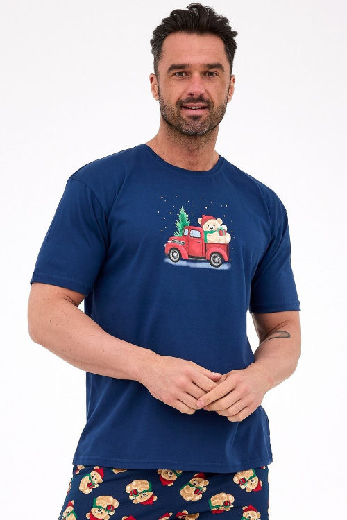 Piżama męska z kolekcji Merry Christmas , wysokiej jakości miękka bawełna , koszulka z krótkim rękawem z przodu kolorowy nadruk z misiem , do kompletu krótkie, wzorzyste spodnie , pakowana w ozdobne pudełko . Skład: 100% bawełna.