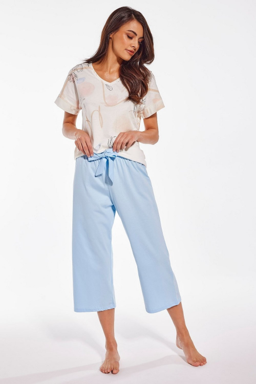 Piżama damska z wysokiej jakości bawełny. Wzorzysta koszulka z krótkim rękawem. Do kompletu szersze spodnie 7/8. Skład: 100% bawełna.