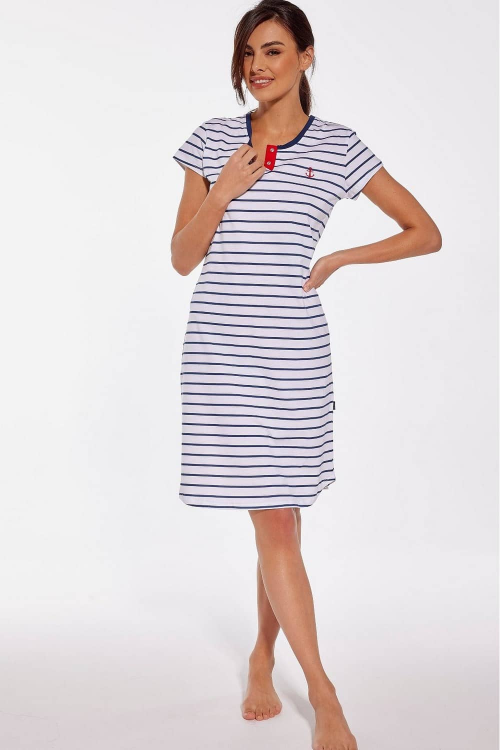Koszula damska z kórtkim rękawem, uszyta z wysokiej jakości bawełny o marynarskim wzorze, dekolt rozpinany na napy. Długość koszuli do kolan. Piżama pakowana w pudełko.skład: 100% bawełna