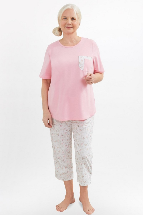 Bawełniana piżama damska z wysokiej jakości bawełny, krótki rękaw na wysokości piersi mała kieszonka wzorzyste spodnie typu rybaczki. Skład: 100% bawełna.