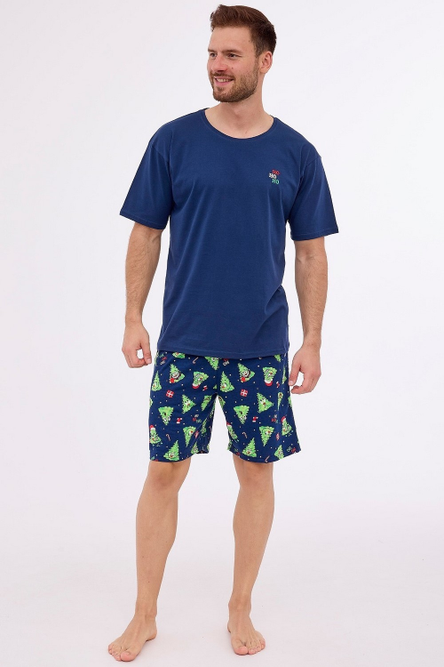 Piżama męska wysokiej jakości bawełna, świąteczne motywy , koszulka z krótkim rękawem, dekolt okrągły na piersi delikatny nadruk , spodenki krótkie, wzór w choinki w pasie wygodna guma obszyta bawełną. Skład: 100% bawełna.