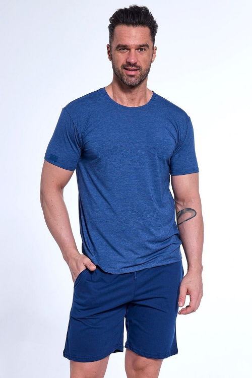 Piżama męska , koszulka melanżowa, z mieszanki dzianiny bawełnianej i modalu , krótki rękaw , dekolt okrągły, luźne bawełniane spodenki, długość do kolan w pasie gumka i wiązany troczek do regulacji obwodu pasa , na biodrach kieszenie . Skład: koszulka 47% modal, 24% bawełna, 5% elastan; spodenki 100% bawełna.