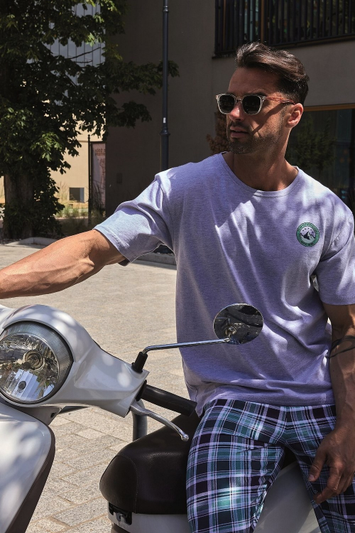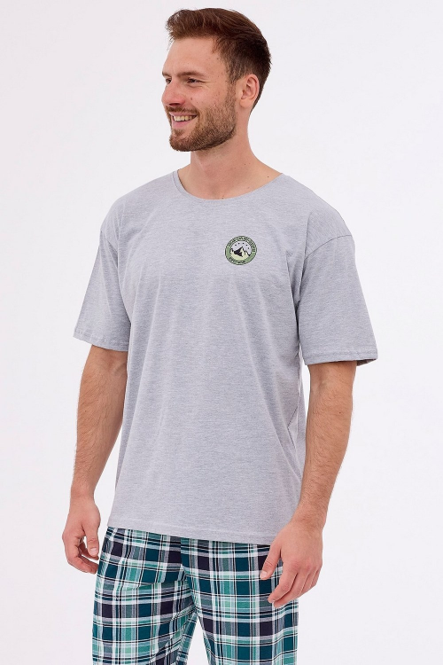 Piżama męska z miękkiej bawełny. Bluza z krótkim rękawem, przód zdobi kolorowy nadruk. Spodnie długie wzorzyste. Skład: koszulka 92% bawełna, 8% poliester; spodnie 100% bawełna.