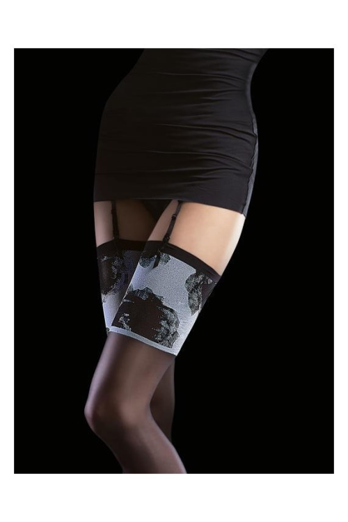 Ekskluzywne i zmysłowe pończochy do paska z pięknym fantazyjnym wzorem. Matowe z niewidoczną strukturą wzmocnienia części palcowej.