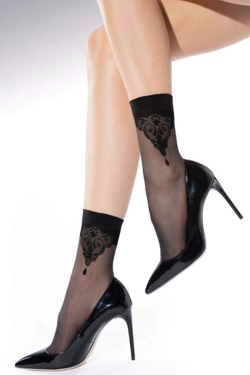 Cienkie damskie skarpetki z szerokim ściągaczem wykończonym wzorem opadającym nad kostką. Skład: poliamid 90%, elastan 10%.