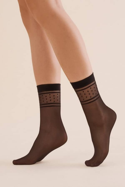 Cienkie skarpetki 20 den ozdobione delikatnym wzorem wygodny ściągacz. Skład: 85% poliamid, 15% elastan.