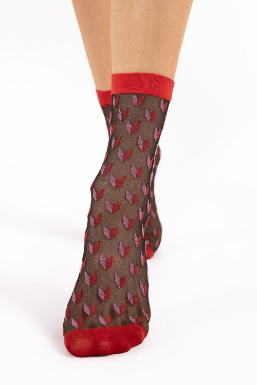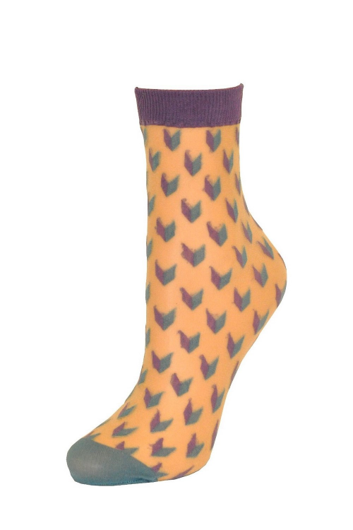 Cienkie skarpetki 20 den , ozdobione kolorowym wzorem, wygodny ściągacz . Skład uzależniony od koloru: 79-86% poliamid, 8-15% polipropylen, 6% elastan.