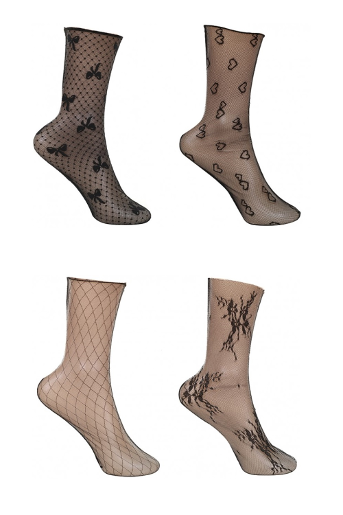 Skarpety damskie imitacja kabaretki , różny wzór na całości .Występuje kolor:czarny mix wzór.Pakowane po 6 mix. Skład:90 % poliamid , 10% elastan.