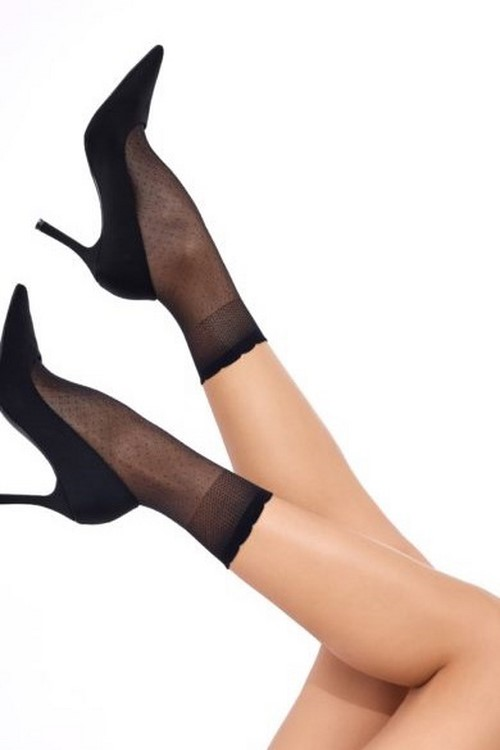 Skarpetki damskie wzorzyste wykonane z przędzy oplatanej. Bezuciskowy ściągacz. Skład: POLIAMID 88%, ELASTAN 12%.