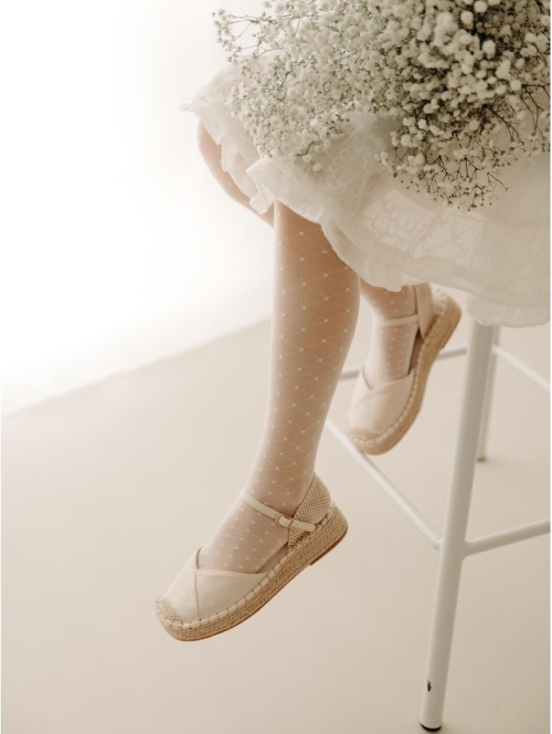 Rajstopy dziewczęce grubość 15 den wzór kropeczki idealne na komunię. Skład: 87% poliamid, 10% elastan, 3% polipropylen.