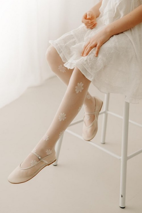 Rajstopy w dekoracyjny wzór kwiatów średniej wielkości na pastelowym, cielistym tle. Tło farbowane na delikatny, cielisty róż, dający efekt naturalnej bieli, dzięki czemu dekoracyjny, biały wzór jest lepiej wyeksponowany , wiosenny hit, idealne również na komunię , przyjemna w dotyku, jedwabista, matowa dzianina , niewidocznie wzmocniona, gładka część palcowa , dodatkowo wzmocniona część majteczkow, wysokiej jakości przędze od europejskich producentów , zaprojektowane i wyprodukowane lokalnie Skład: 87% poliamid ,3% elastan ,10% polipropylen.