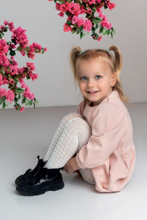 Dziewczęce rajstopy ażurowe wykonane z przędzy oplatanej gwarantującej zwiększoną wytrzymałość. Wszyty klin. Skład: 92% Poliamid ,8% Elastan.
