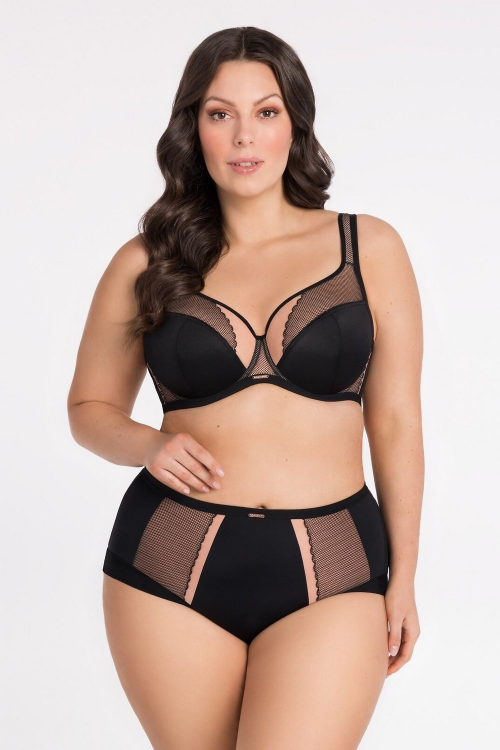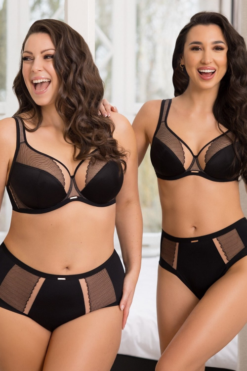 Ten biustonosz jest idealny do noszenia na co dzień. Jest wygodny i podtrzymujący. Miseczki dobrze trzymają piersi na miejscu i tworzą piękny kształt. Dolne części miseczek wykonane ze stabilnej, matowej dzianiny. Górna część wykonana jest z prześwitującego tiulu, na który naszyta jest piękna. Baskinka i środek biustonosza wykonana gładniej dzianiny i tiulu. Miseczki wyprofilowane są drutem okalającym piersi. Zapięcie: haftka 3-stopniowa, dwu- i trzyrzędowa w zależności od rozmiaru.Skład: 90% Poliamid, 7% Elastan, 3% Poliester