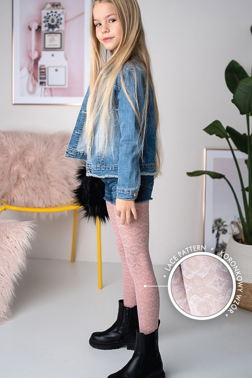 Dziewczęce rajstopy wzorzyste wykonane z przędzy oplatanej gwarantującej zwiększoną trwałość. Skład: 85% poliamid, 15% elastan.