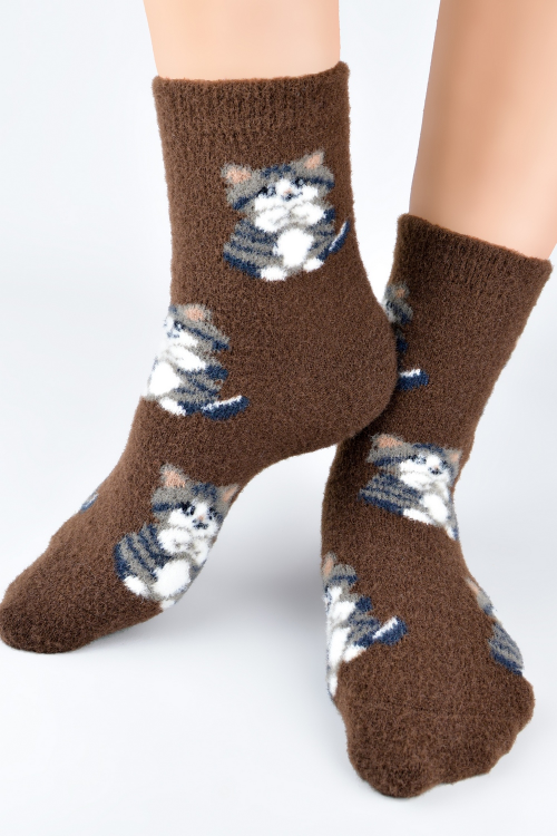 Skarpety damskie, miękka puchata dzianina , nieuciskający ściągacz , wzór w koty idealne na prezent. Skład: 86% poliamid, 12% elastan, 2% elastan.