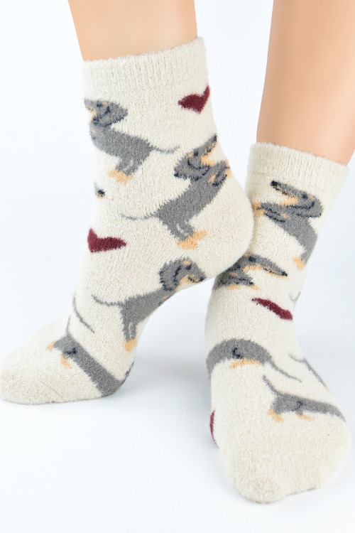 Skarpety damskie, miękka puchata dzianina , nieuciskający ściągacz , wzór w psy i serca , idealne na prezent. Skład: 86% poliamid, 12% elastan, 2% elastan.