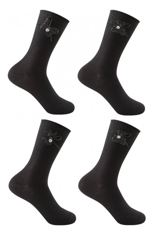 Skarpety damskie, wzór przyszyta aplikacja , wykończne bezuciskowym ściągaczem .Występują kolory: czarny .Pakowane po 6 mix.