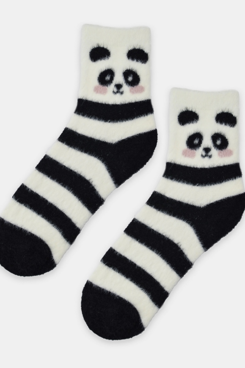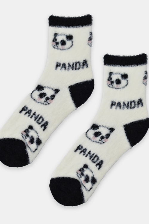Skarpety damskie miękka, puchata dzianina ozdobny wzór w pandy, wygodny, nieuciskający ściągacz. Skład: 95% poliamid, 5% elastan.