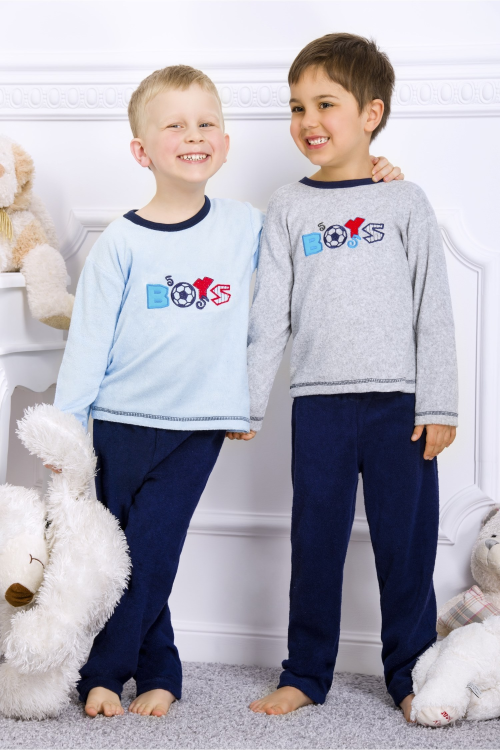 Dwukolorowa piżamka dziecięca z dzianiny FROTTE, ozdobiona haftem z aplikacją. Rękawy i dół spodni wykończone ściągaczem.