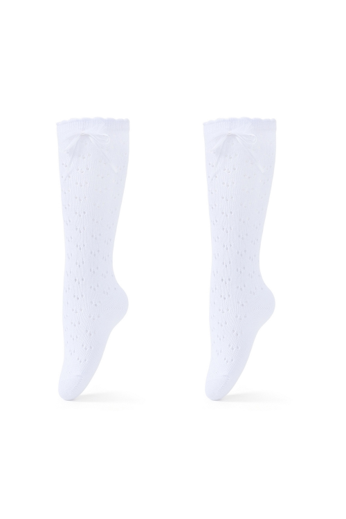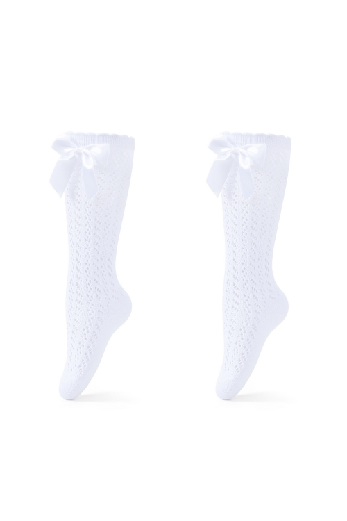 Podkolanówki dziewczęce ażurowe z kokardką. Skład: 72% bawełna, 24% poliester, 4% elastan.