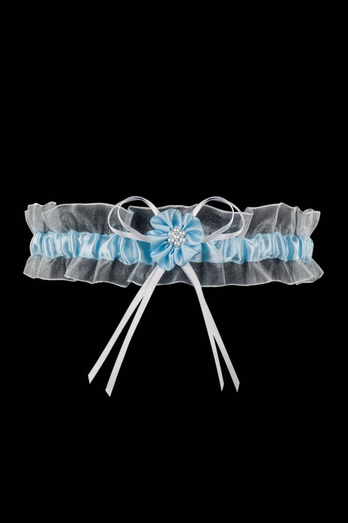 Błękitno-biała, typowo ślubna podwiązka z satynowej taśmy, wykończonej na górze i na dole delikatnym tiulem, ozdobiona białą kokardką oraz błękitnym kwiatkiem z drobnymi perełkami w środku.
