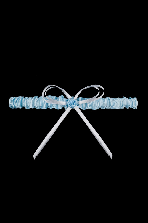 Wąska podwiązka na podstawie z błękitnej, satynowej tasiemki. Jej środek zdobi biała kokardka oraz niebieski kwiatek z materiału.