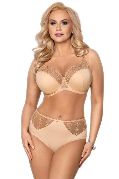 Biustonosz semi-soft posiada w każdym rozmiarze fiszbinę boczną. model od wewnętrznej strony w górnej części miski przy mocowaniu ramiączka wzmocniony tiulem. zapięcie 2 rzędowe z 4 haftkami w rzędzie. Skład: 75% poliamid, 15% elastan, 5% poliester, 5% bawełna.