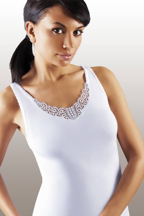 Bawełniana koszulka damska na szerokim ramiączku. Dekolt w kształcie litery V ozdobiony efektowną gipiurą.