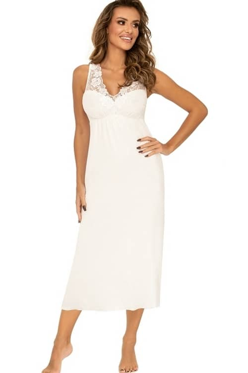 Długa koszulka damska ,wysokiej jakości wiskoza linia biustu, ramiączka i plecy z koronki o kwiatowym motywie , pod biustem gumka, długość do łydki. Skład: 90% wiskoza, 5% elastan, 5% polyester.
