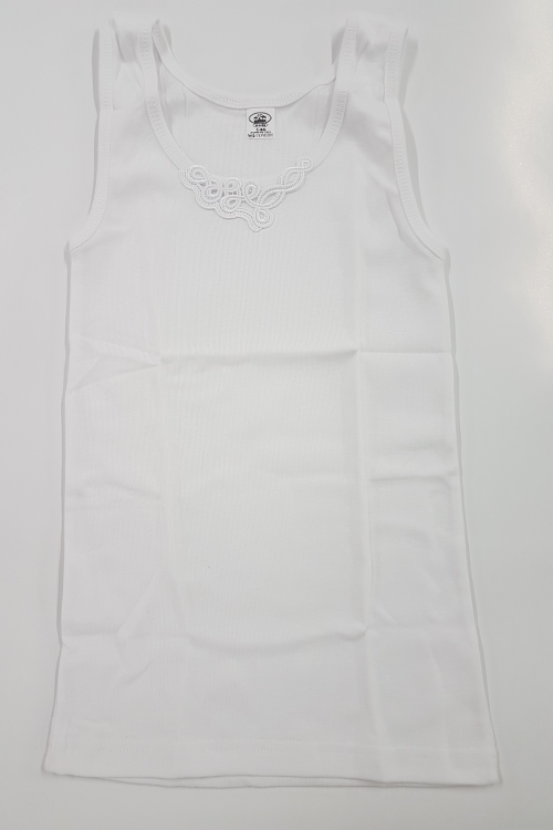 Komunijna koszulka dziewczęca na ramiączkach. Dekolt półokrągły wykończony haftem. Wykonana z wysokiej jakości bawełny.