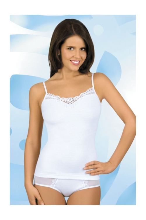 Koszulka damska bawełniana, dekolt ozdobiony gipiurą, wąskie ramiączko.