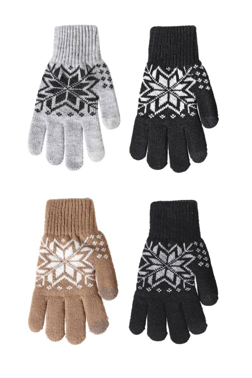 Rękawiczki damskie 5 palczaste z przyjemnej dzianiny idealne na chłodne dni wzór żakardowy do ekranów dotykowych. Opakowanie 6 mix kolor. Skład:90% acryl,7% poliester,3% elastan.