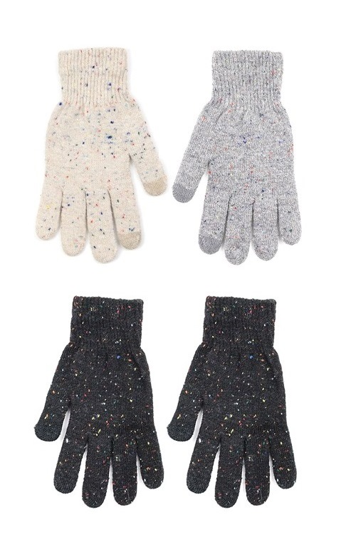 Rękawiczki damskie 5 palczaste z przyjemnej dzianiny idealne na chłodne dni wzór melanżowy do ekranów dotykowych. Opakowanie 6 mix kolor.Dostępne kolory: jasny szary,granat,czarny,ecri,ciemny róż,fuksja. Skład:90% acryl,7% poliester,3% elastan.