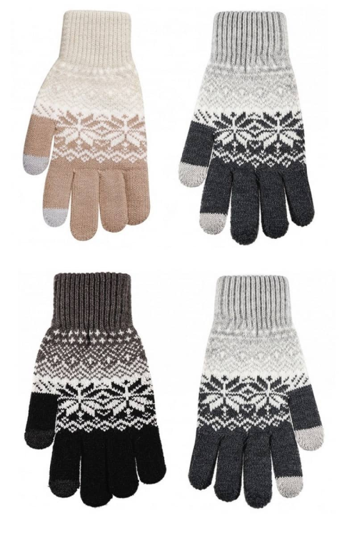 Rekawiczki damskie żakardowe przystosowane do smartfonów na dotyk.Skład: 90% akryl,7% poliester,3% elastan. Opakowanie 6 mix kolor ( grafit,czarny,beż).