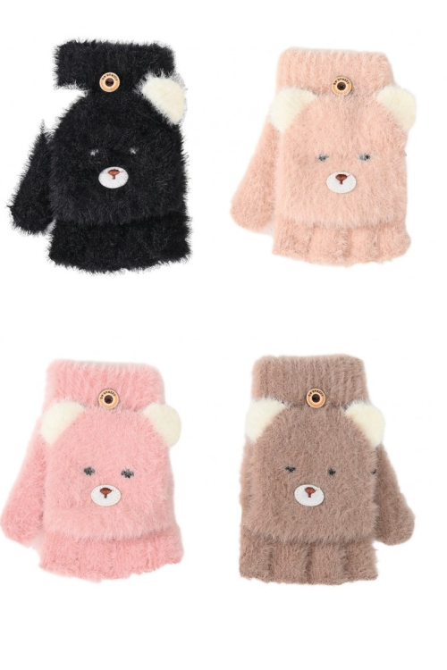 Rękawiczki młodzieżowe typu mitenki, miękka dzianina z puszystym włoskiem, klapka zakładana na paluszki, klapka w misie. Idealne na chłodne dni. Dostępne kolory: szary, różowy, beżowy.Opakowanie 6mix kolor. Skład: 90% nylon, 10% elastan.