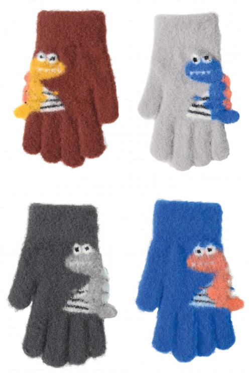 Rękawiczki dziecięce miękkie puchate, pięciopalczaste na boku rękawiczki puchaty Dinozaur . Idealne na chłodne dni. Dostępne kolory:ciemny niebieski , brąz , jasny szary , grafit .Opakowanie 6mix kolor. Skład: 90% nylon, 10% elastan.
