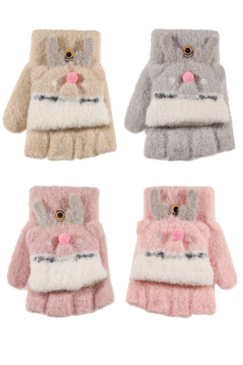 Rękawiczki dziecięce typu mitenki, miękka dzianina z puszystym włoskiem, klapka zakładana na paluszki, klapka z reniferkiem. Idealne na chłodne dni. Dostępne kolory: szary, różowy, beżowy.Opakowanie 6mix kolor. Skład: 90% nylon, 10% elastan.
