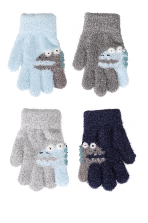 Pięciopalczaste rękawiczki dziecięce miękka dzianina z puszystym włoskiem ozdobione wzorem z dinozaurem.Idealne na zimowe dni. Dostępne kolory: szary, niebieski, granatowy, grafitowy.Opakowanie 6 mix kolor. Skład: 90% nylon, 10% elastan.