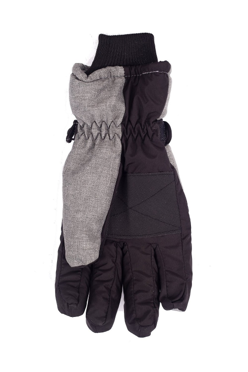 Rękawice narciarskie, męskie dwukolorowe , pięciopalczaste od wewnątrz ocieplone , nadgarstek zakończony ściągaczem, poniżej pasek zapinany na rzep od wewnętrznej strony dłoni teksturowany materiał, zapewniający przyczepność. Skład: 100% poliester.