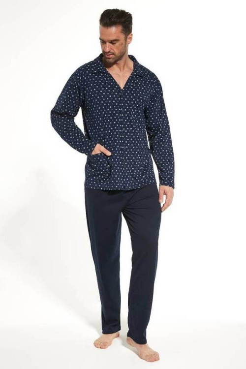 Piżama męska z wysokiej jakości bawełny. Bluza w kratkę, zapinana na guziki z kołnierzykiem, z kieszeniami. Spodnie długie, jednolite. Skład: 100% bawełna.