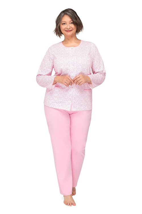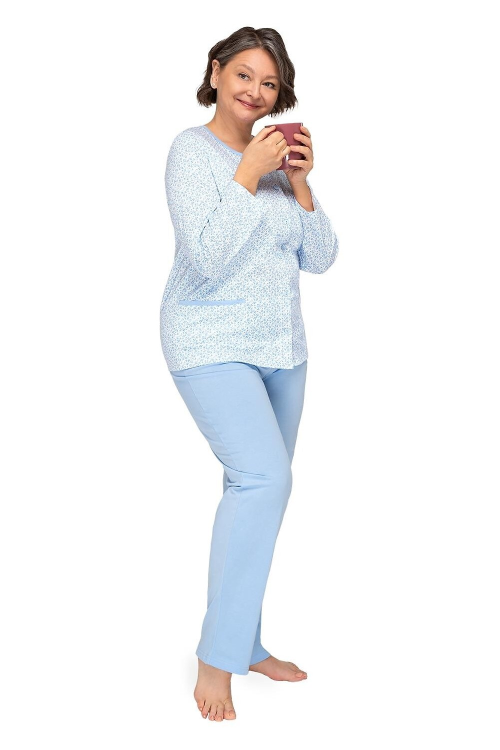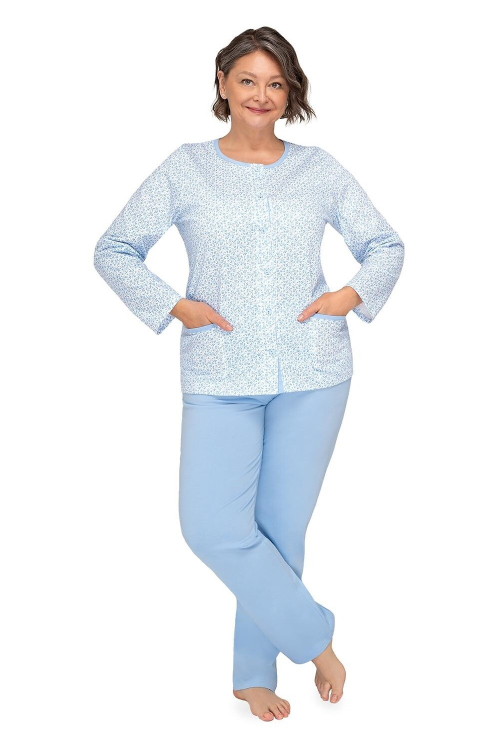 Piżama damska wykonana z delikatnej bawełny, koszulka wzorzysta, zapinana na guziki, długi rękaw, po bokach naszyte kieszenie, spodnie długie, jednolite. Skład: 100% bawełna.