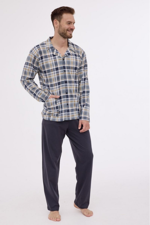Klasyczna piżama męska z długim rękawem i kołnierzykiem, rozpinana. Na wysokości bioder kieszenie. Do kompletu jednolite spodnie z prostymi długimi nogawkami. Piżama pakowana w pudełko. Skład: 100% bawełna.